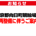 2025年10月9日 / 最終更新日時 : 2025年12月22日 muko8874 お知らせ 競輪場再整備に伴うご案内 競輪場再整備に伴うご案内 令和7年10月1日(水)より再整備工事のため、投票所および東入場駐車エリアの利用範囲が大幅に縮小されております。 これに伴い、場内をご利用のお客様にご不便をおかけする […]