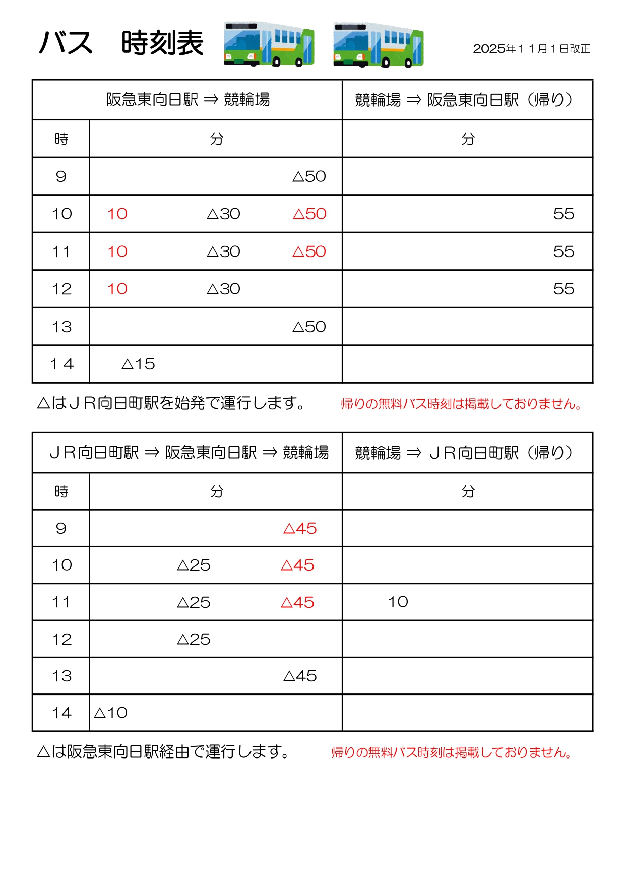 2025年10月8日 / 最終更新日時 : 2025年10月15日 muko8874 お知らせ 無料バス時刻変更のお知らせ 競輪場無料送迎バスについて11月から運行時刻が変更となりますのでご注意ください。 みなさまのご来場お待ちしております。