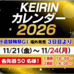 2025年11月12日 / 最終更新日時 : 2025年11月14日 muko8874 イベント 「KEIRINカレンダー2026]配布について 今年もKEIRINカレンダーを配布いたします!! ■KEIRINカレンダー2026 小倉 競輪祭GⅠ 場外発売3日目より! 11月21日(金)~11月24日(月) ■整理券配布時間 毎日下記時間にて整理券 […]